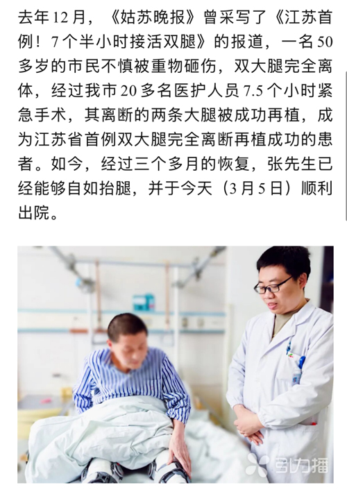 江苏省首例双大腿完全离体断肢再植手术相关报道