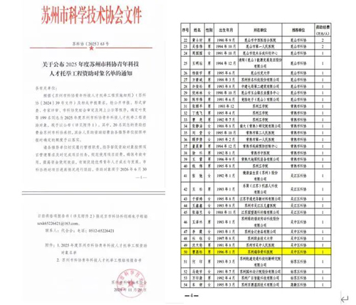2025年11月20日,苏州瑞华骨科医院创面修复科曹高标获批苏州市科协青年科技人才托举工程项目。
