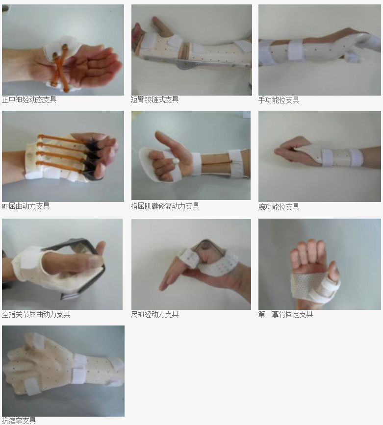 矫形器的品种和形式多样,以低温热塑板(高分子材料)为主要材料,加上支架、弹性材料(橡皮筋、钢丝、弹簧)、手指配件(指套、指钩、导线)等,运用人体解剖学和生物力学原理,设计的一种体外装置,具有以下几个功能: