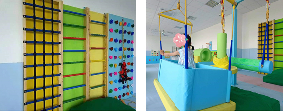 3. 感统治疗室:训练滑梯、飞碟秋千、圆形木马秋千、吊桥、滚轮滑梯、前庭摇摆平衡训练器、豆袋、拉架床、四件套攀爬组合等。